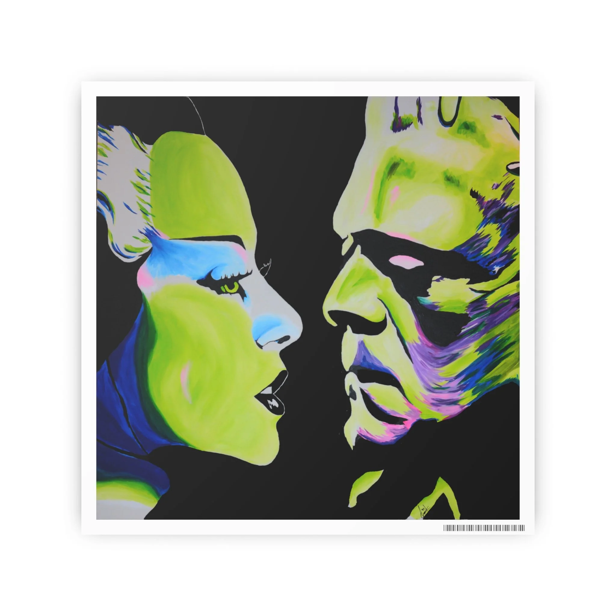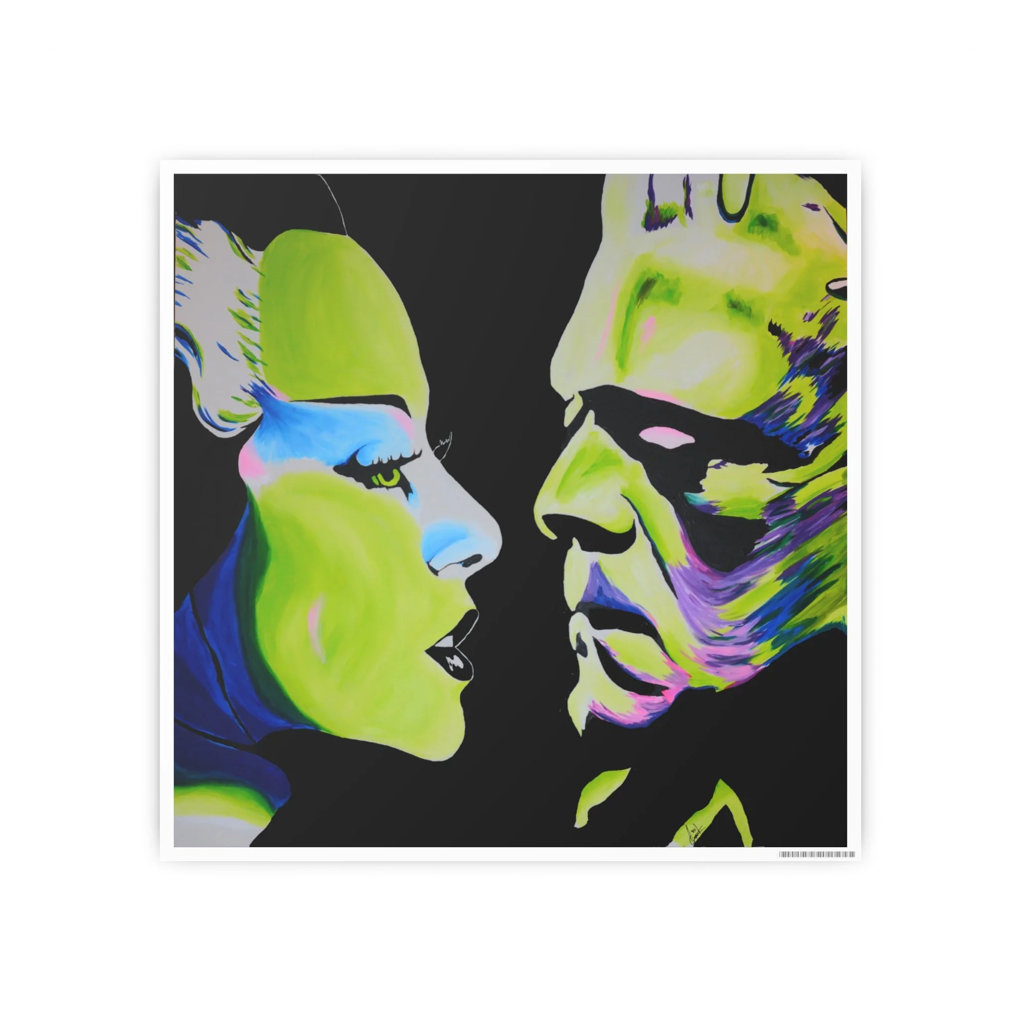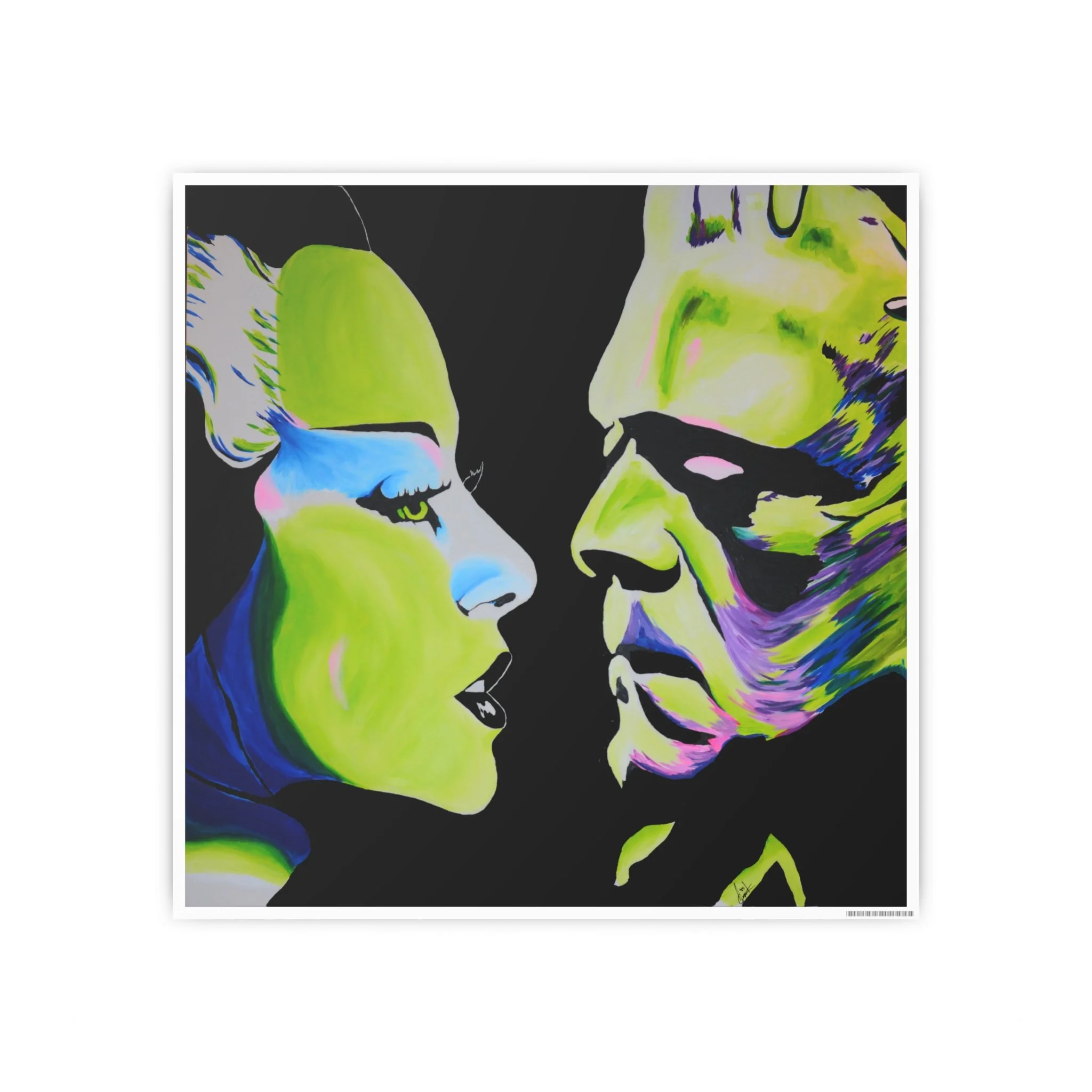 Gothic romance lives on in this striking portrait of the Bride of Frankenstein and Frankenstein’s monster. Printed from Andrew Cronk’s original hand-painted piece.